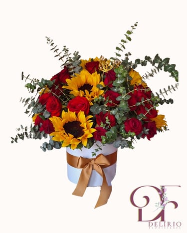 La combinación perfecta de amor y alegría. Rosas rojas y girasoles dispuestos en una elegante caja blanca con lazo dorado.