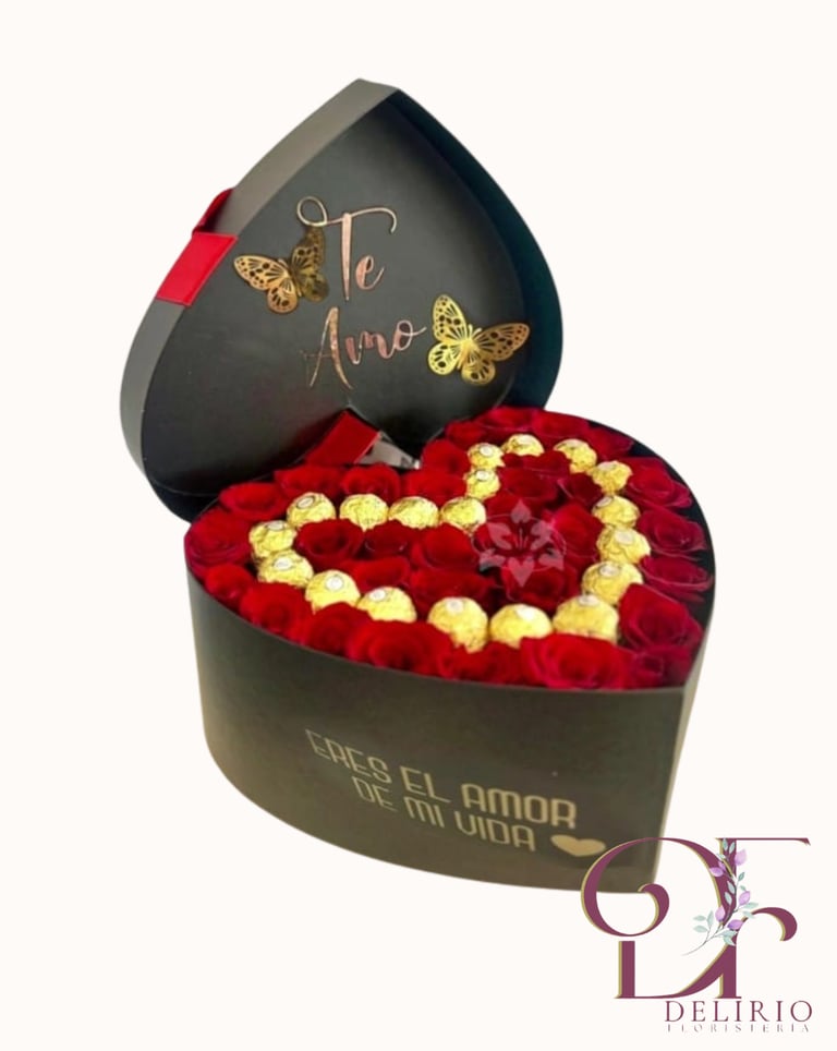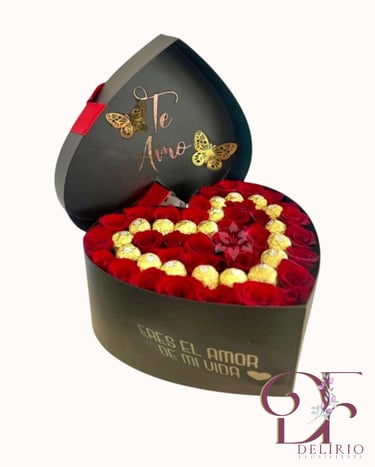 Caja en forma de corazón con rosas y chocolates Ferrero. Ideal para aniversarios y fechas románticas.