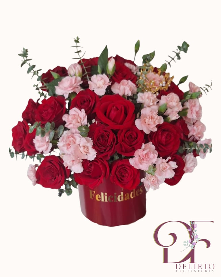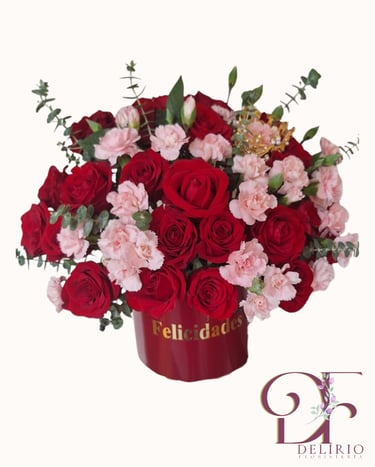 Nuestra firma exclusiva. Una combinación exuberante de rosas rojas y rosadas en caja de lujo, celebrando momentos especiales.