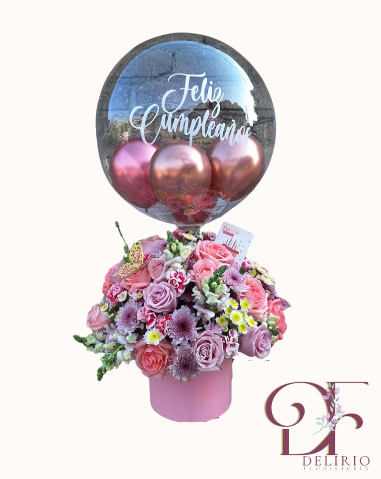 Un diseño de ensueño con altura y elegancia, flores de stock y rosas, coronado con globo burbuja para quien reina en tu corazón.