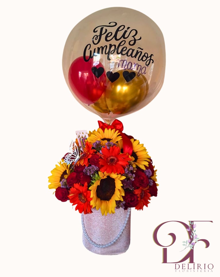 Espectacular arreglo con globo burbuja personalizado, acompañado de girasoles y flores en tonos cálidos en una base brillante.