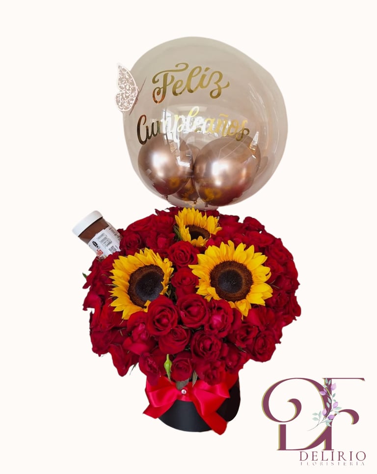 El regalo más dulce y completo. 50 rosas rojas rodeando girasoles vibrantes, coronado con un globo personalizado y un delicioso frasco de Nutella.