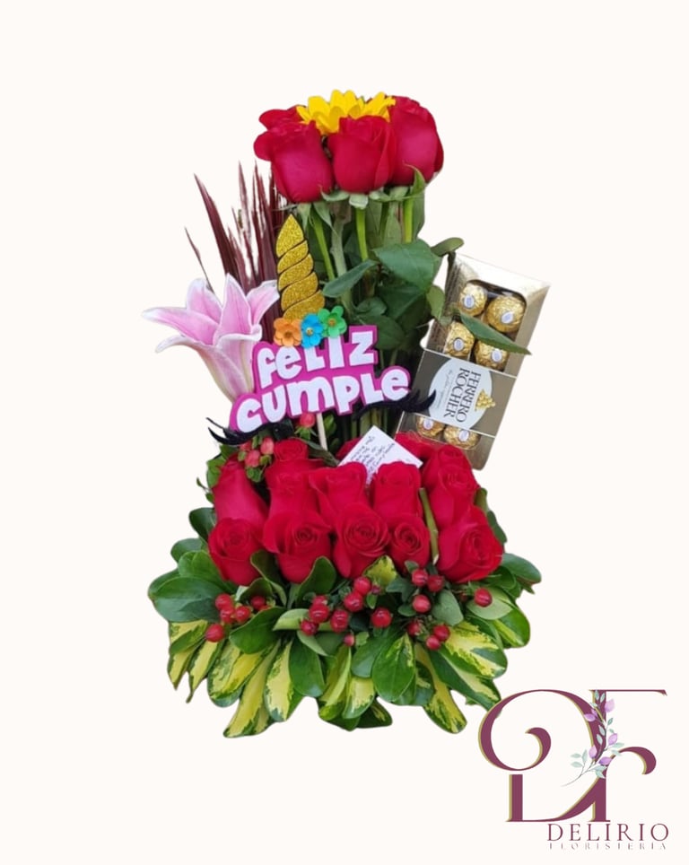 Arreglo floral con rosas, lilis y girasol, incluye chocolates Ferrero y topper de “Feliz Cumpleaños”.