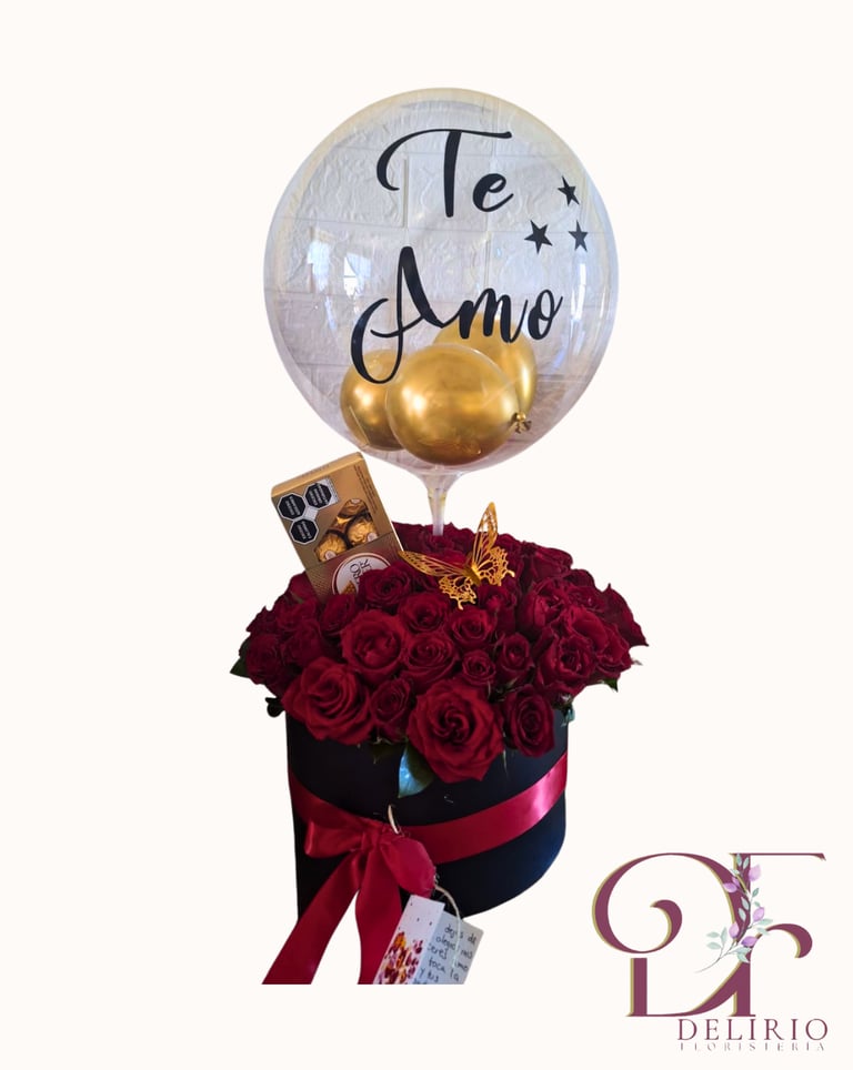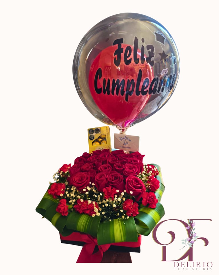 Arreglo floral con rosas rojas, follaje, globo burbuja y chocolates Ferrero.