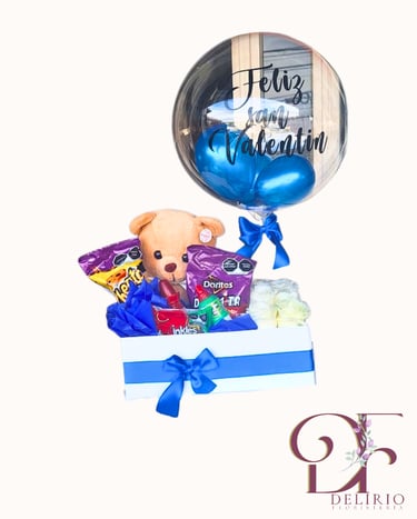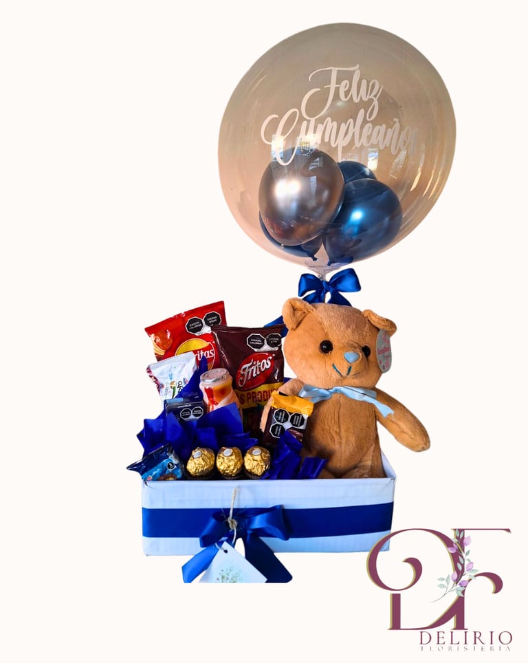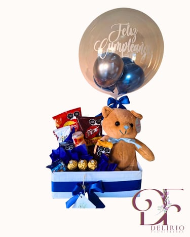 La sorpresa perfecta para iniciar el día. Caja decorada con deliciosos snacks, bebidas refrescantes y un globo festivo.