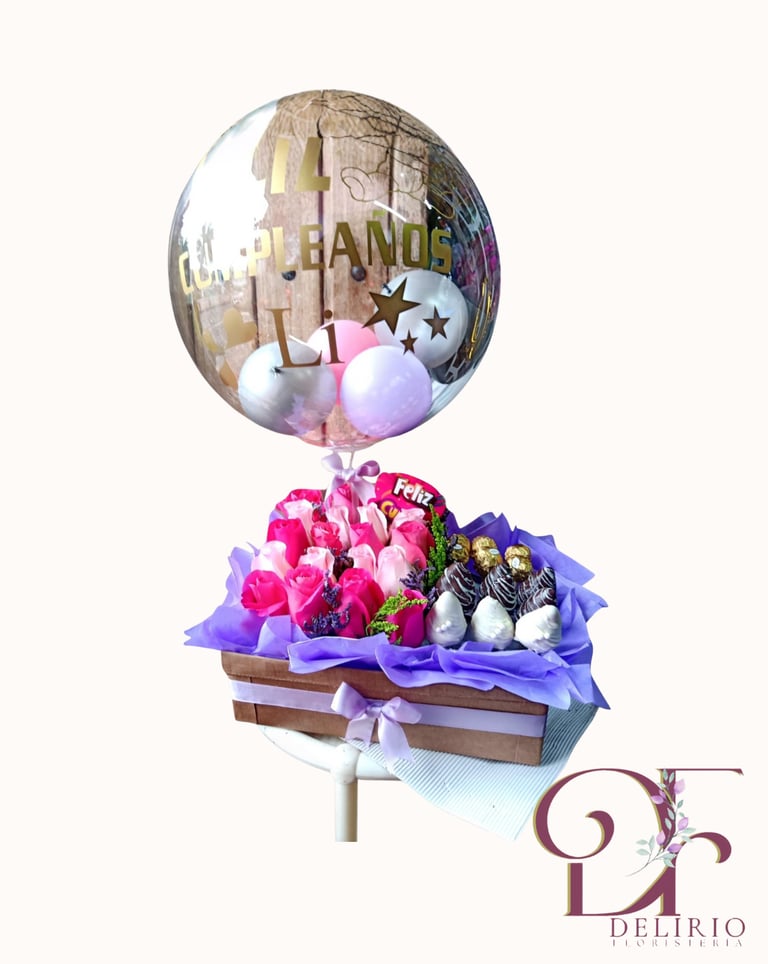 Arreglo de rosas en tonos rosas con fresas cubiertas de chocolate, chocolates Ferrero y globo burbuja.
