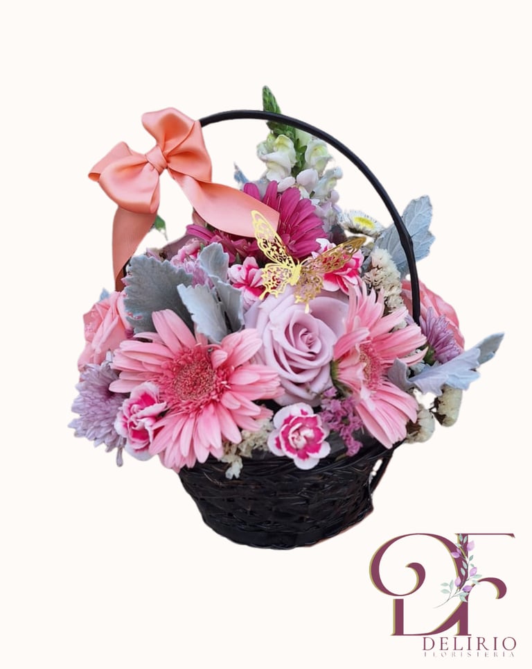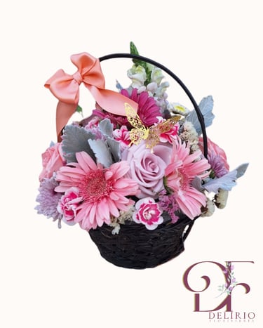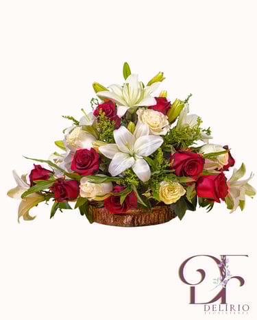 Centro de mesa elegante con lilis y rosas, perfecto para eventos especiales.