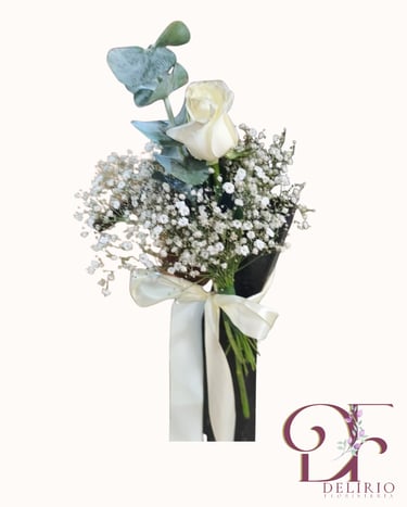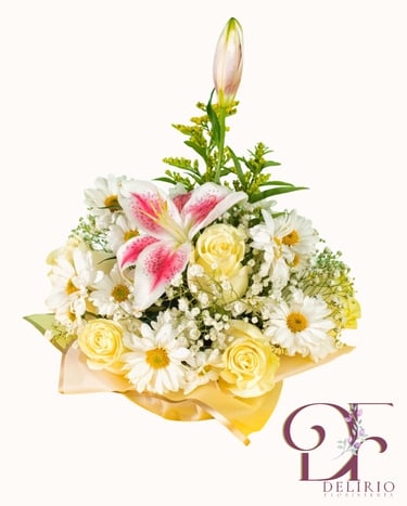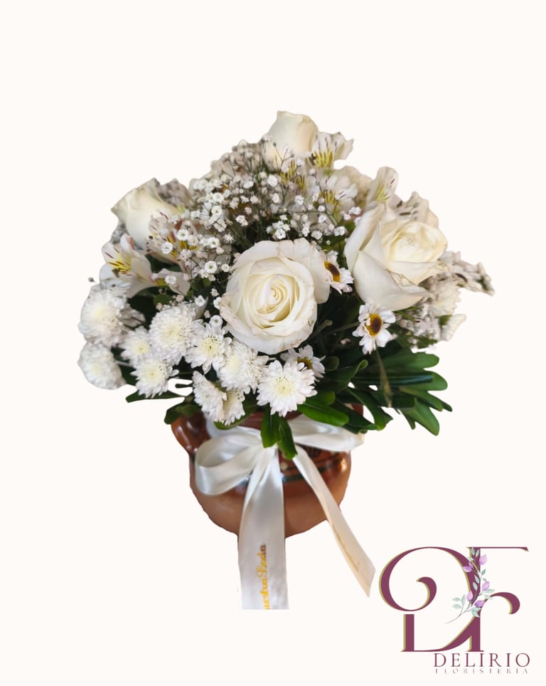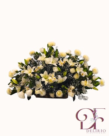 Arreglo con lilis, rosas y follajes blancos, ideal para bodas y ceremonias religiosas.
